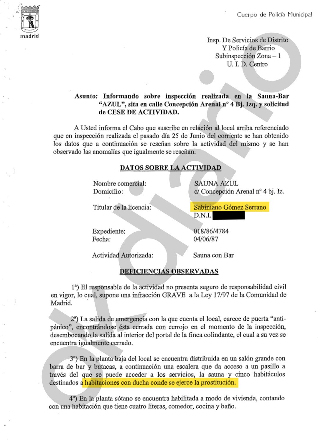 El informe policial del 28 de junio de 2004 es meridiano. Un cabo de la Policía solicitó expresamente el cese de actividad del establecimiento Sauna Azul, situado junto a la Gran Vía madrileña, tras lo que observó. El documento señala que «la actividad principal del mismo no es la recogida en licencia (Sauna con bar) y sí facilitar y beneficiarse del ejercicio de la prostitución».