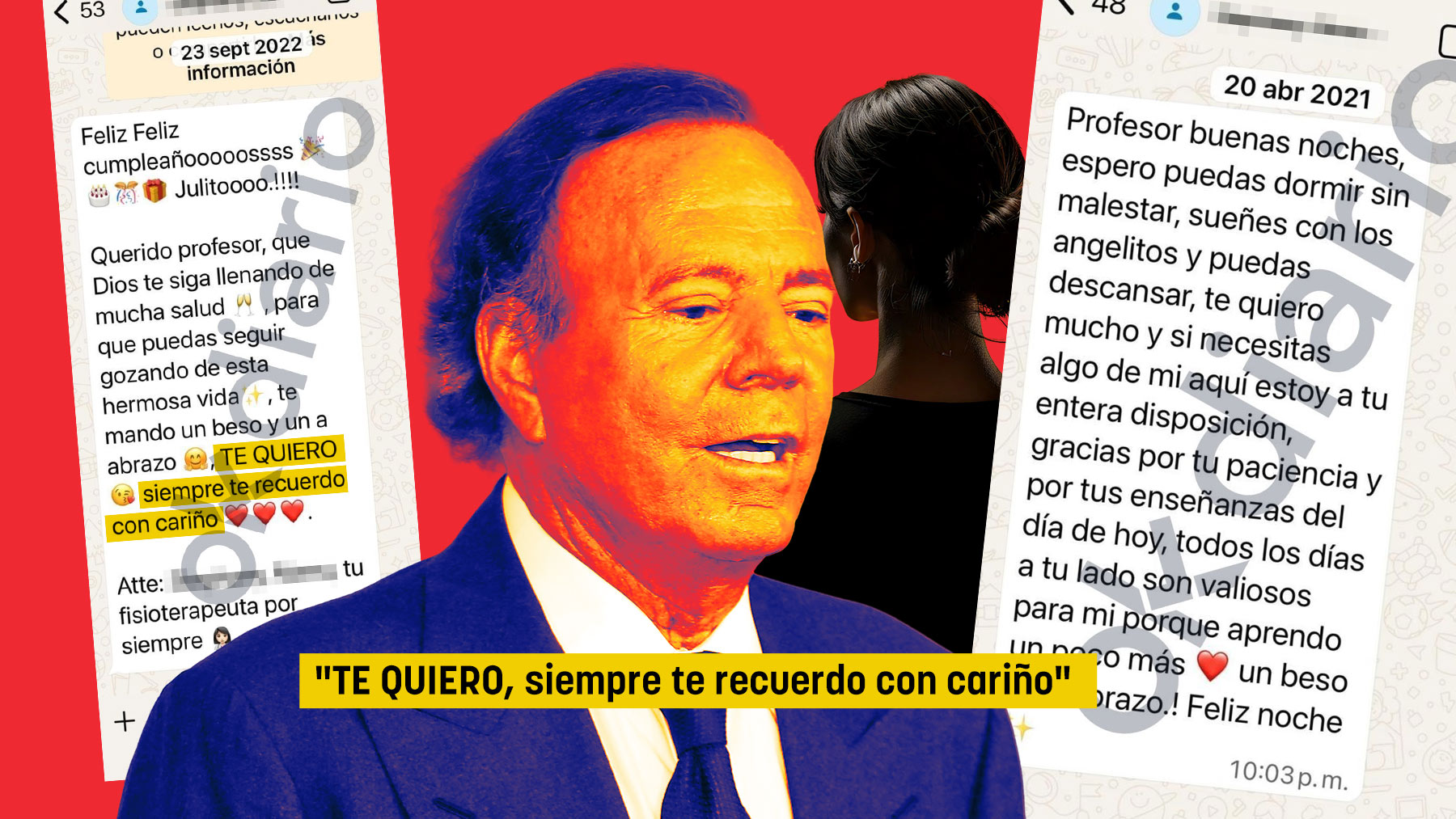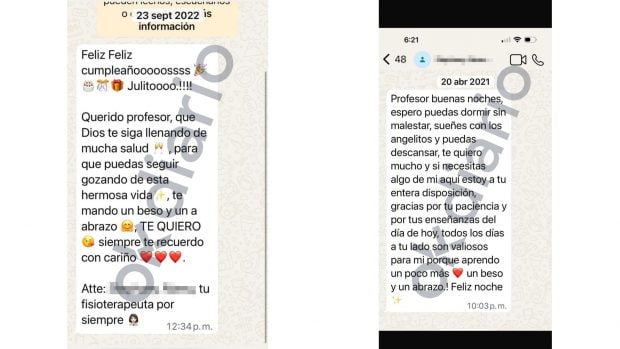 Los mensajes de WhatsApp que la fisioterapeuta venezolana envió a Julio Iglesias entre 2021 y 2022. En ellos se puede leer expresiones como «TE QUIERO», «siempre te recuerdo con cariño», «todos los días a tu lado son valiosos para mí» y «tu fisioterapeuta por siempre».