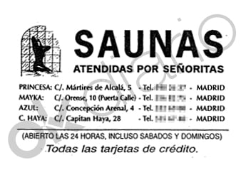 Los folletos publicitarios que la red de saunas de la familia de Begoña Gómez utilizaba para captar clientela en Madrid durante décadas fueron clave en la lucha vecinal para que el Tribunal Superior de Justicia momentáneamente consiguiera la retirada de la licencia de la sauna prostíbulo del Paseo de la Castellana número 180, en Madrid.