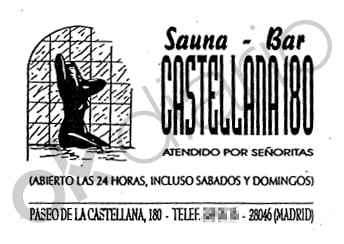 Los folletos promocionales mostraban el logotipo de «Sauna – Bar CASTELLANA 180» con la dirección «PASEO DE LA CASTELLANA, 180 – 28046 MADRID». El material publicitario incluía la leyenda «Todas las tarjetas de crédito», evidenciando la dimensión comercial del negocio familiar.