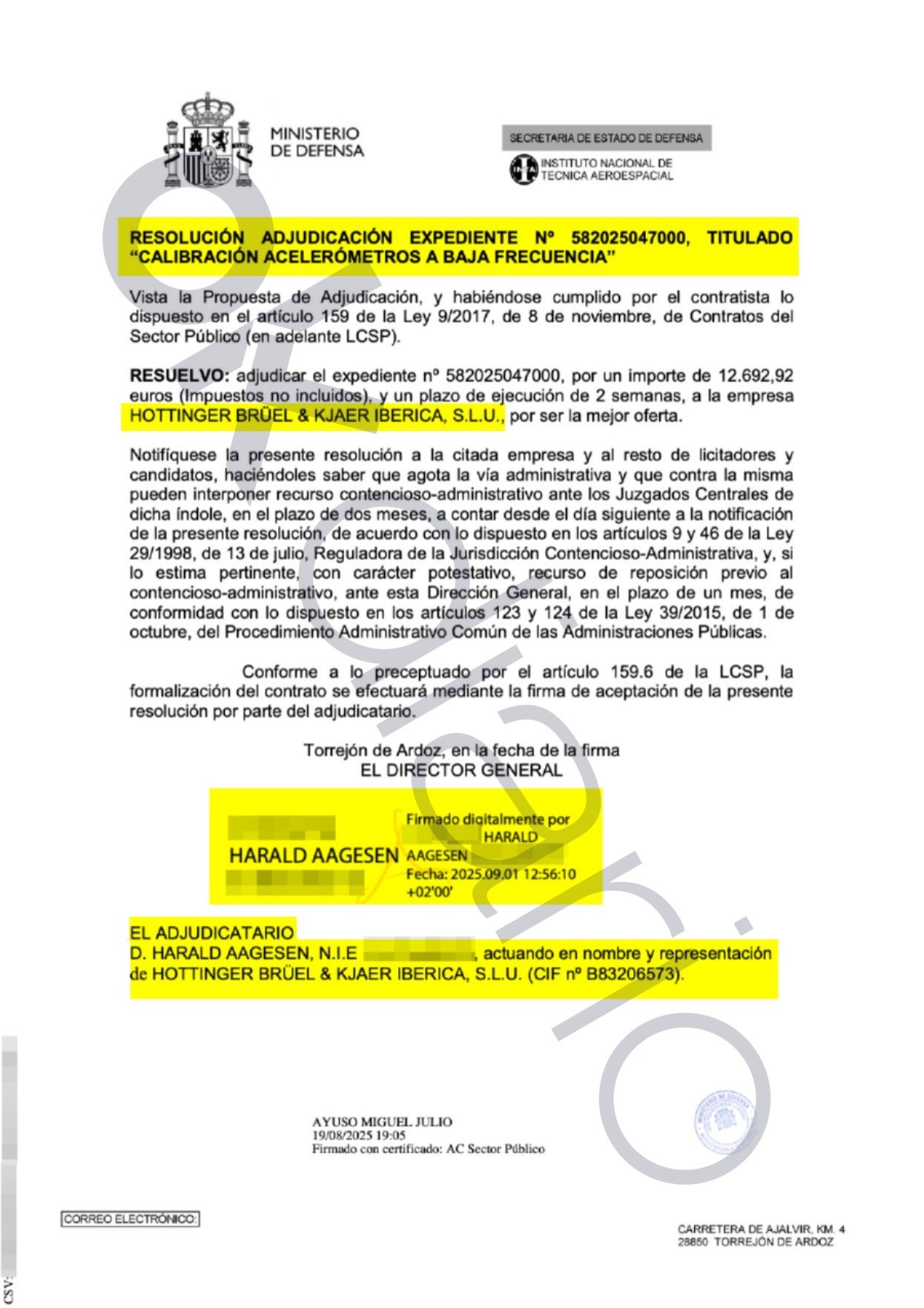 Dos días antes, el 10 de septiembre de 2025, también el Ministerio de Defensa, a través de la secretaría general del Instituto Nacional de Técnica Aeroespacial (INTA), dio un contrato menor por importe de 9.580,78 euros, impuestos incluidos, a la empresa de la que es directivo el hermano mayor de Sara Aagesen. En este caso, el objeto del contrato otorgado a dedo fue el suministro de un «Módulo de amplificación y conexión para amplificador HBM MGCplus».
