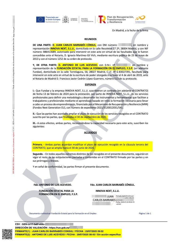En la firma electrónica de la parte contratante, esto es, el director gerente de la Fundación Estatal para la Formación en el Empleo (Fundae), Antonio de Luis Acevedo, aparece la fecha del 29 de julio. Por su parte, la rúbrica de Barrabés tuvo lugar el 23 de julio.