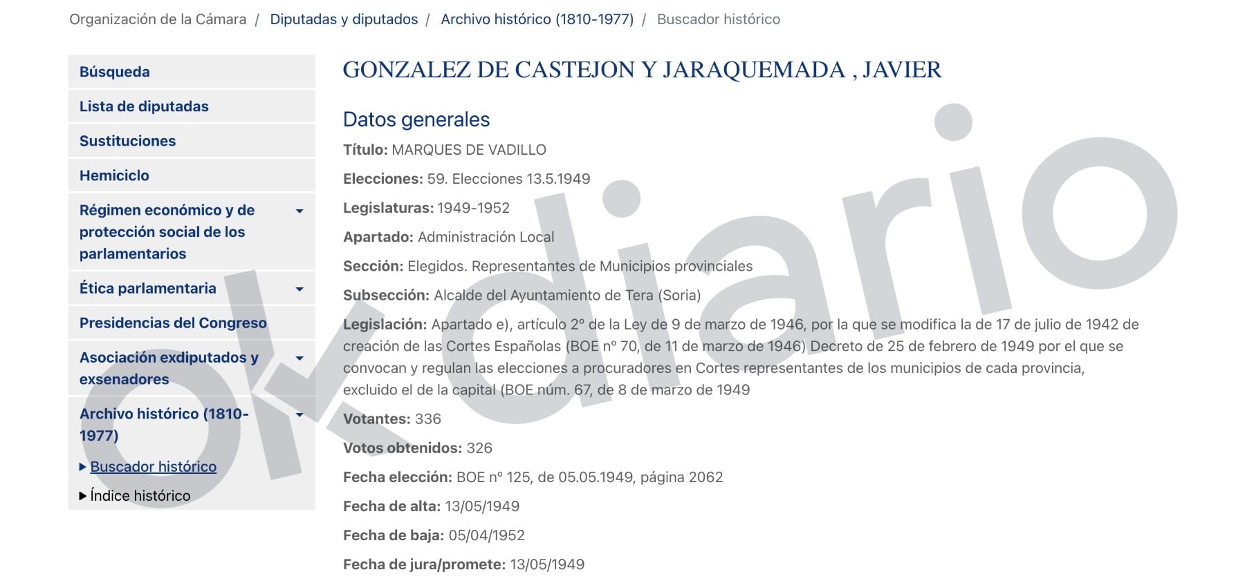Según consta en el archivo histórico del Congreso de los Diputados, Francisco Javier González de Castejón y Jaraquemada, «alcalde del Ayuntamiento de Tera», fue procurador entre 1949 y 1952 como representante municipal.