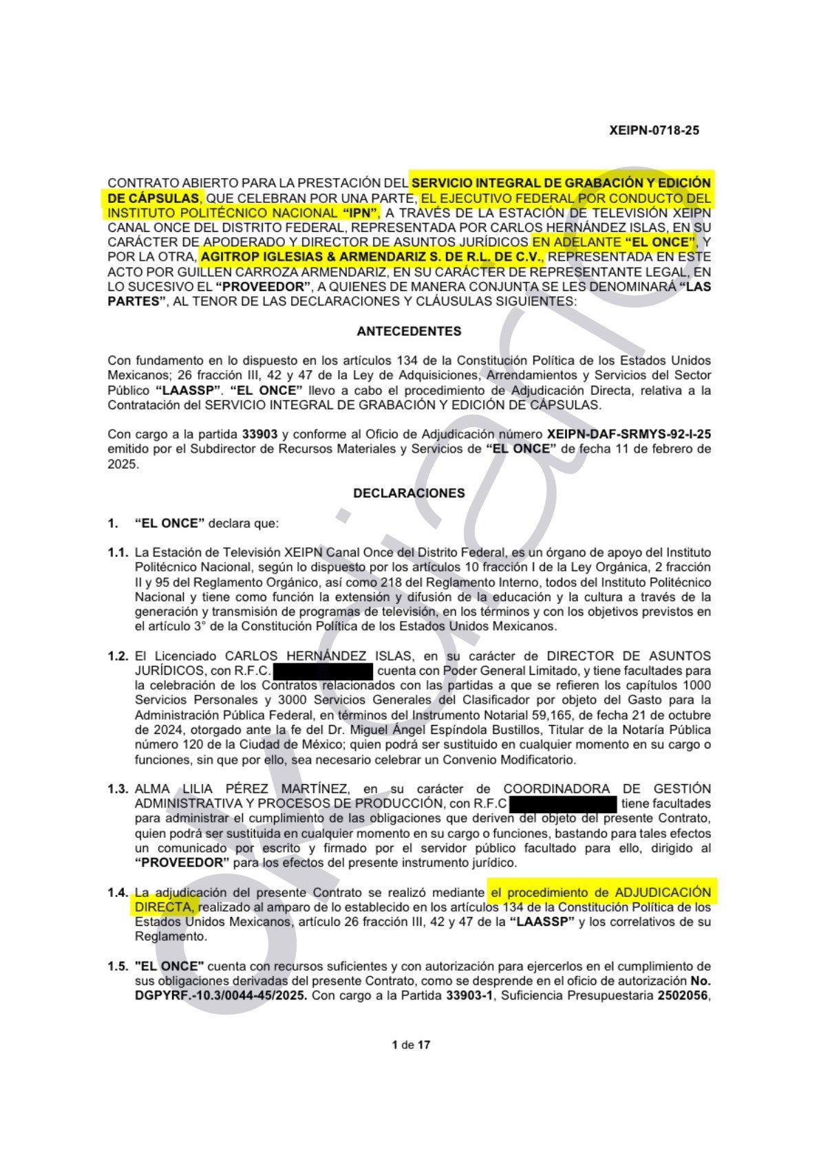 Asimismo, OKDIARIO tuvo acceso a otro contrato para la prestación de un «servicio integral de grabación y edición» de piezas de vídeo para el programa de tertulia política Masiosare que emita Canal Once, cadena de televisión pública mexicana perteneciente al Instituto Politécnico Nacional (IPN), entidad adscrita a la secretaría de Educación Pública del Gobierno de Sheinbaum.