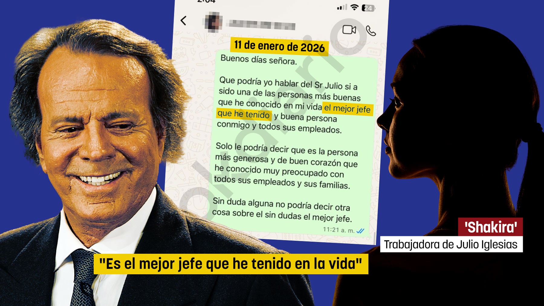 El 11 de enero de 2026, una empleada de Julio Iglesias envió un mensaje al que ha tenido acceso OKDIARIO en exclusiva de WhatsApp a la periodista Elena Cabrera de elDiario.es. El texto era espontáneo, rotundo y demoledor: «¿Qué podría yo hablar del Sr. Julio si ha sido una de las personas más buenas que he conocido en mi vida, el mejor jefe que he tenido y buena persona conmigo y con todos sus empleados?».