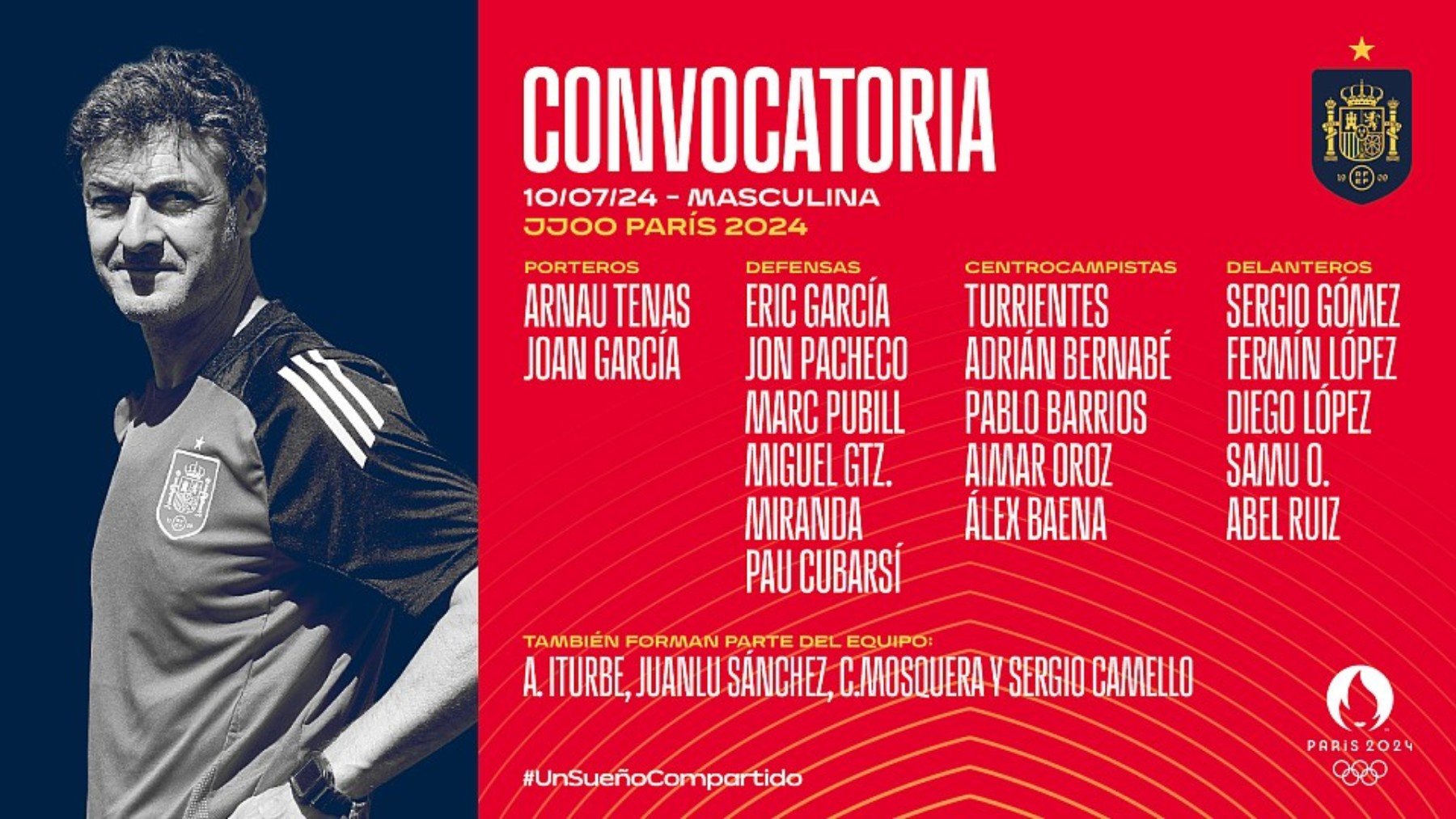 El seleccionador olímpico español ha dado a conocer a los integrantes de la convocatoria y lo ha hecho en un vídeo en el que ha estado acompañado por cuatro integrantes de la España que ganó el oro en Barcelona 92. Se trata de Toni Jiménez, Chapi Ferrer, José Emilio Amavisca y Javier Manjarín, que han anunciado los porteros, defensas, centrocampistas y delanteros que estarán en la capital francesa.