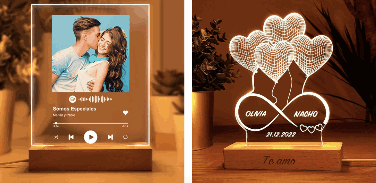 - Más de 40€: joyas personalizadas, lámpara personalizada, caja de madera con fotos, copas de vino grabadas.