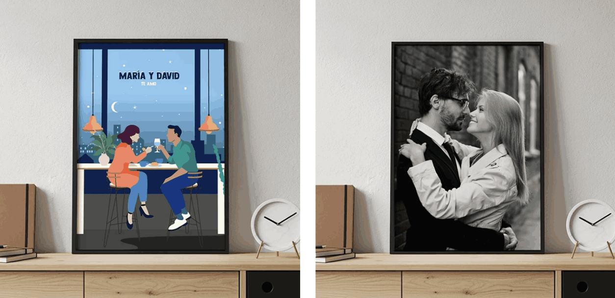 Un póster personalizado es ideal si quieres un regalo romántico que también decore. Puede ser una foto especial, una ilustración minimalista o incluso una caricatura: lo importante es que represente un momento vuestro.