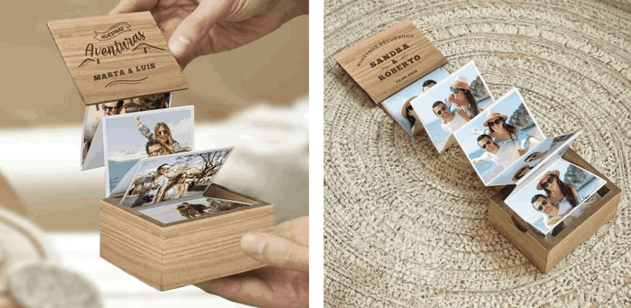 Una caja de madera con fotos (tipo acordeón/desplegable) es de los regalos más emocionales, porque reúne varios momentos de la relación en un solo detalle. Es perfecta si quieres algo romántico, original y con valor sentimental real.