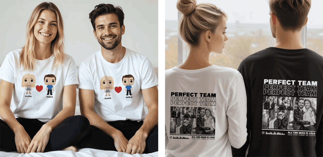 Una camiseta personalizada es un regalo cómodo, visible y muy versátil. Puede ser romántica, divertida o estética, según el diseño. Además, si hacéis dos a juego, queda un detalle perfecto para planes y fotos.