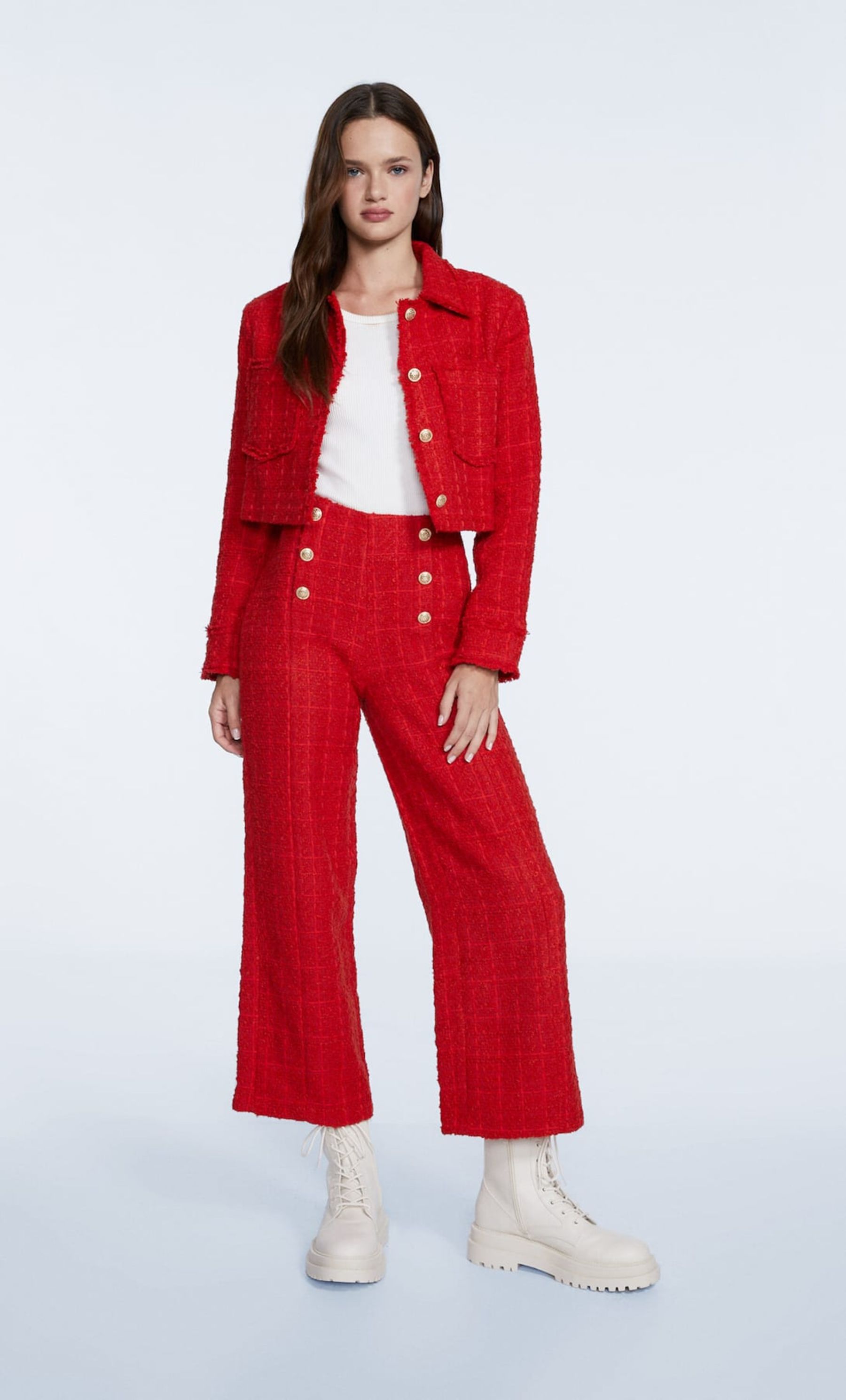 ¿Qué tal algo de color para el martes? Quizás un cazadora»crop» con unos pantalones culotte en color rojo con detalle de botones dorados de Stradivarius, al que añadirle un top o un jersey corto en blanco y botas o botines a juego. Chaqueta (39,99 euros), pantalón culotte estructura (29,99 euros).