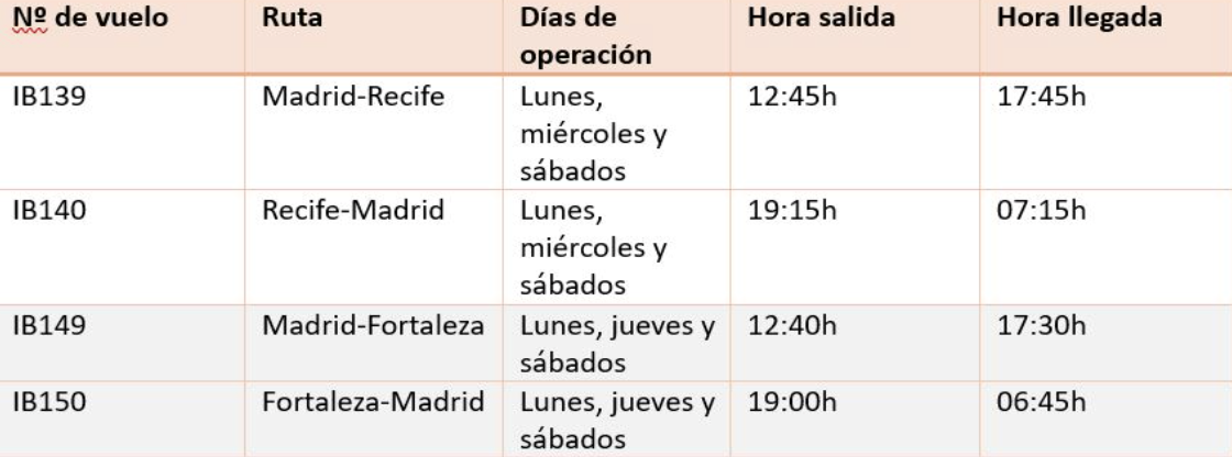 A partir del 13 de diciembre de 2025, Iberia estrenará los vuelos directos Madrid-Recife, con tres frecuencias semanales. Poco después, el 19 de enero de 2026, despegará el primer vuelo hacia Fortaleza, con tres frecuencias semanales. Ambas rutas serán operadas con los nuevos Airbus A321XLR, el modelo más moderno del mercado, con capacidad para 182 pasajeros y configurado en dos clases: Business y Turista.