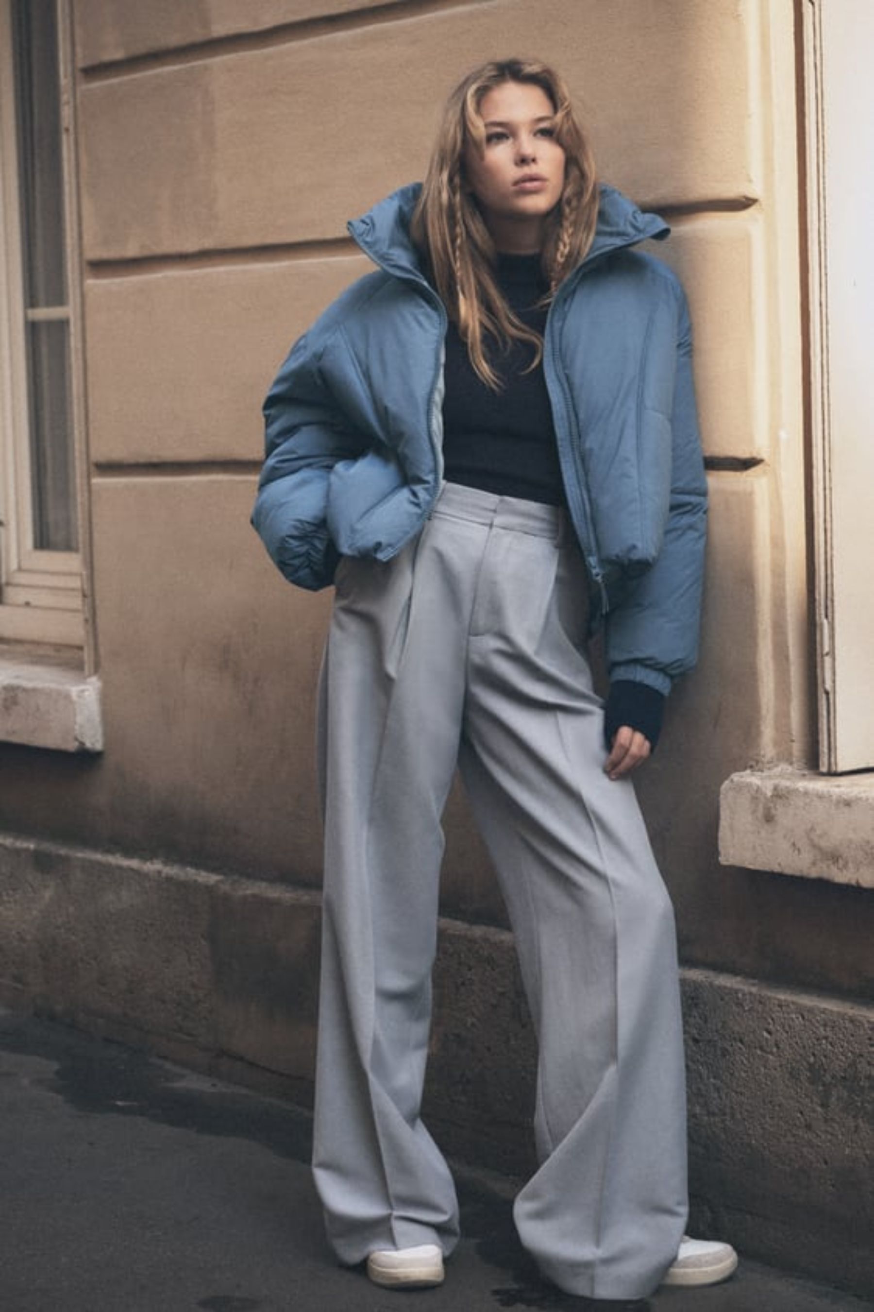 También en esta tienda está arrasando la cazadora corta acolchada de color azul y repelente al agua (49,95 euros), que podéis combinar con jeans o como veis a continuación, con unos pantalones de traje amplios tal y como marcan las tendencias.