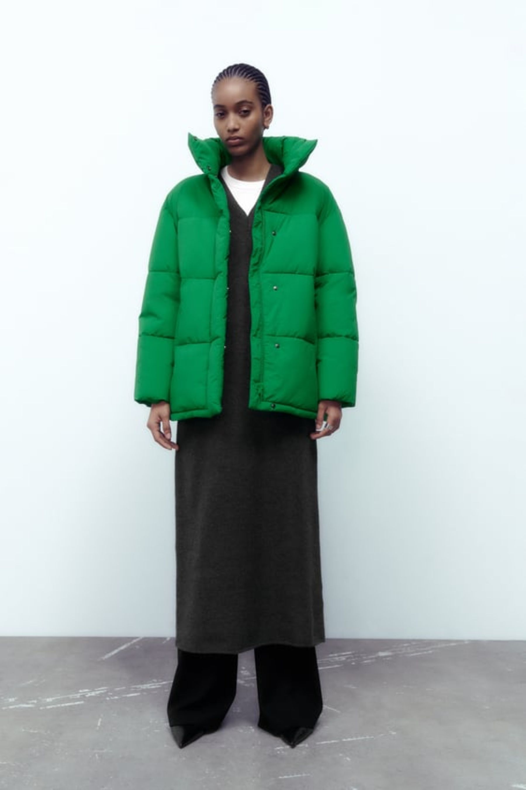 O podéis también elegir chaqueta acolchada más larga y en color llamativo como el verde (59,95 euros) y combinarla con un vestido de punto.