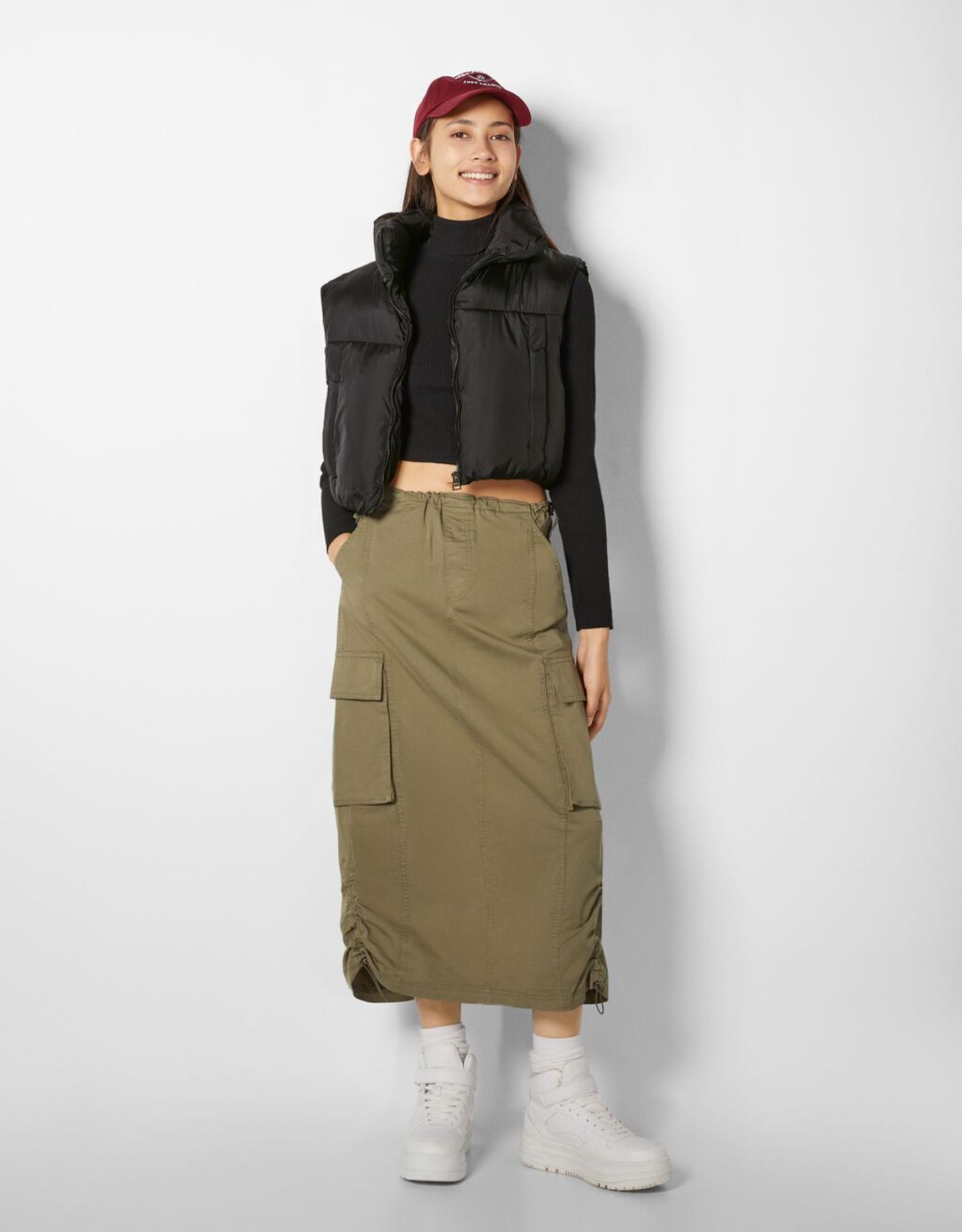 O también puedes elegir el chaleco acolchado (22,99 euros), que presentan combinado con una falda cargo y top de estilo «crop». Un look de diez si te gusta el estilo urbano.