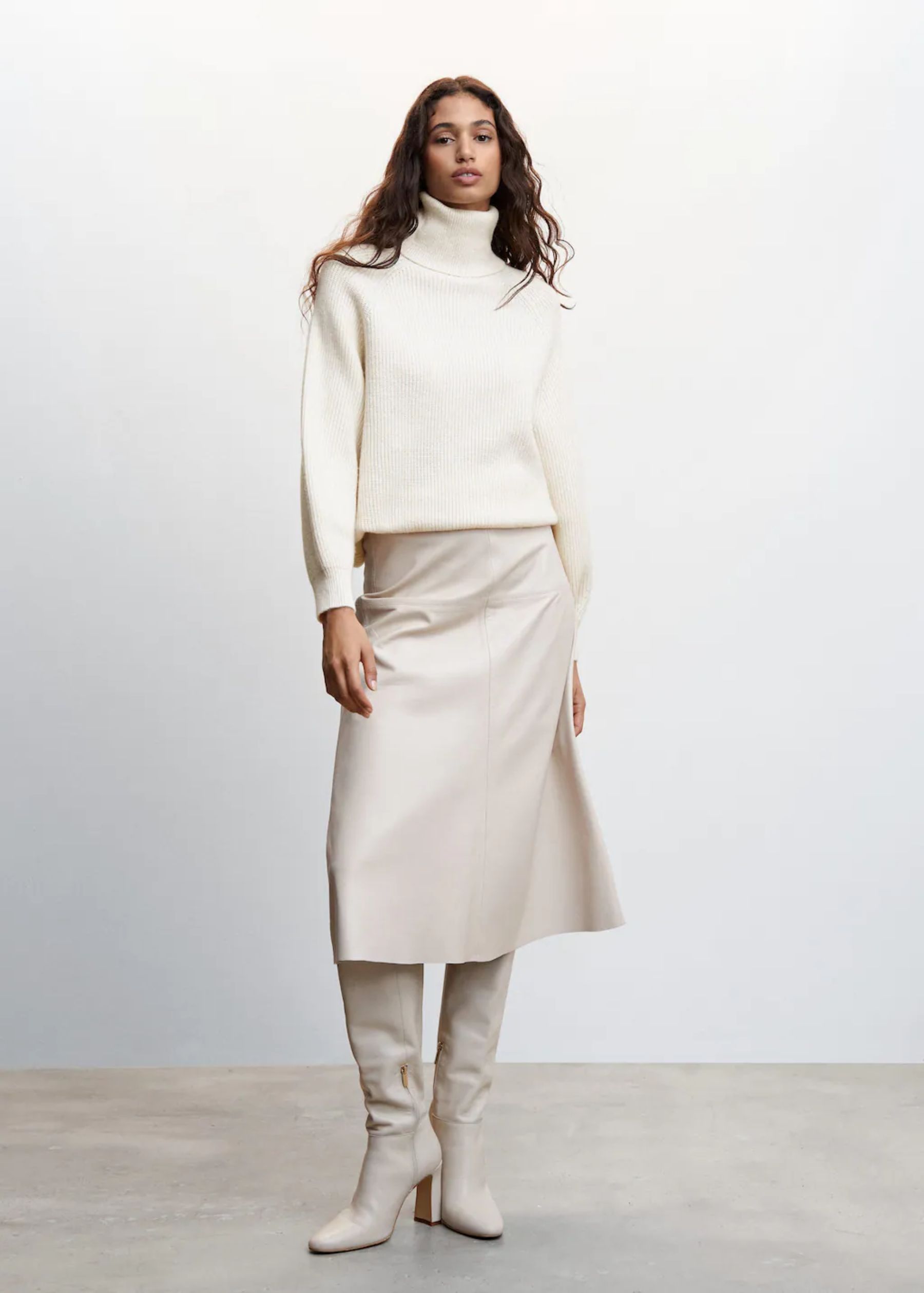Jersey punto cuello vuelto. Este otro look es también perfecto tanto para Nochebuena como Navidad. La pieza clave es el jersey de punto y cuello vuelto en color blanco que podéis combinar con una falda midi del mismo color o de un tono neutro. Precio: 29,99 euros.