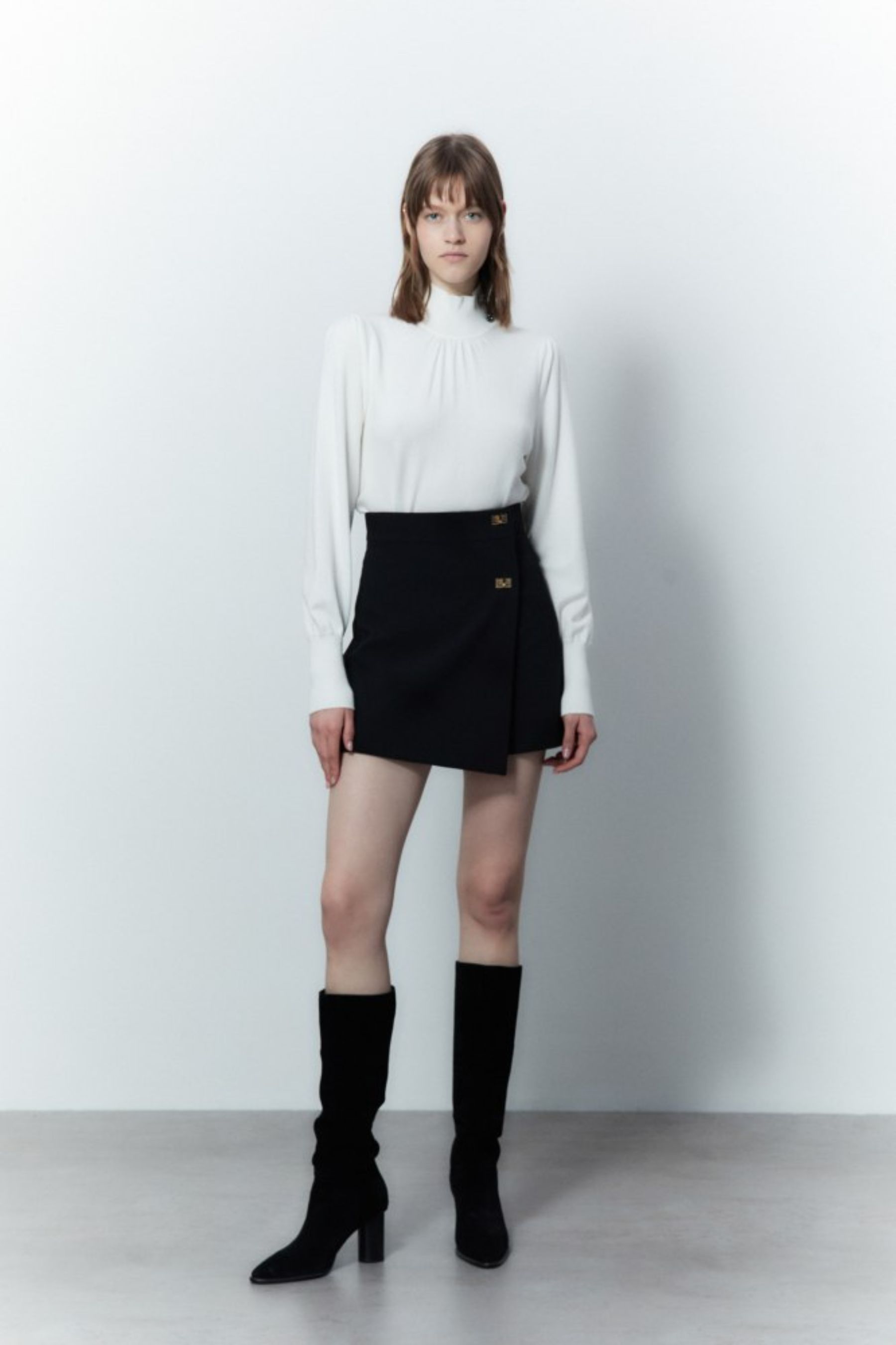 Jersey botón de cuello alto. Lo tienes en blanco y otros colores como el lila. Tiene detalle de joya en el cuello que además es subido. Perfecto para un pantalón o falda larga, pero te quedará genial con una falda corta. Precio: 21,99 euros.