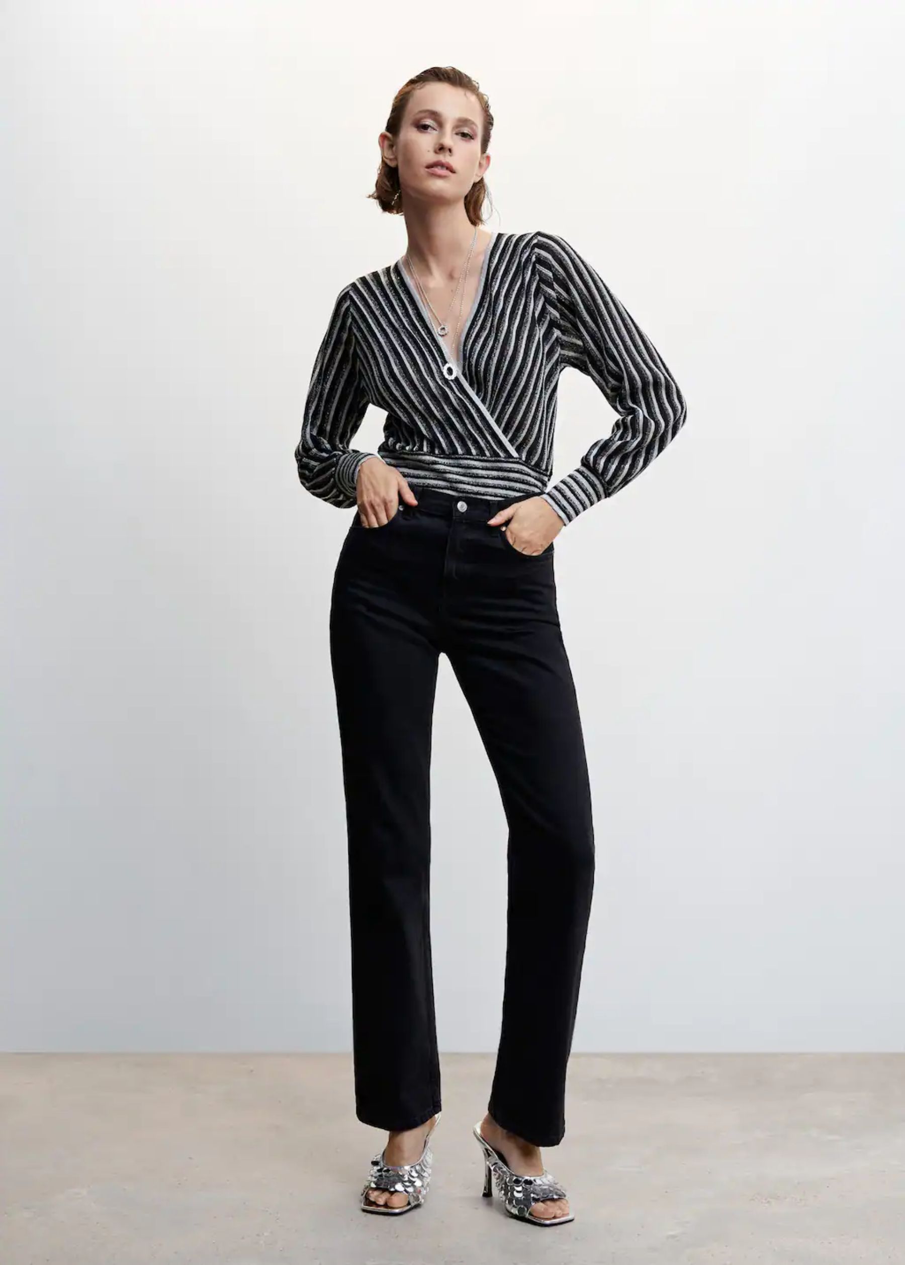 Jersey de Rayas. El estampado de rayas es tendencia este año así que apuesta por modelos de jersey como este con escote cruzado. Perfecto para combinar con un pantalón negro. Precio: 35,99 euros.