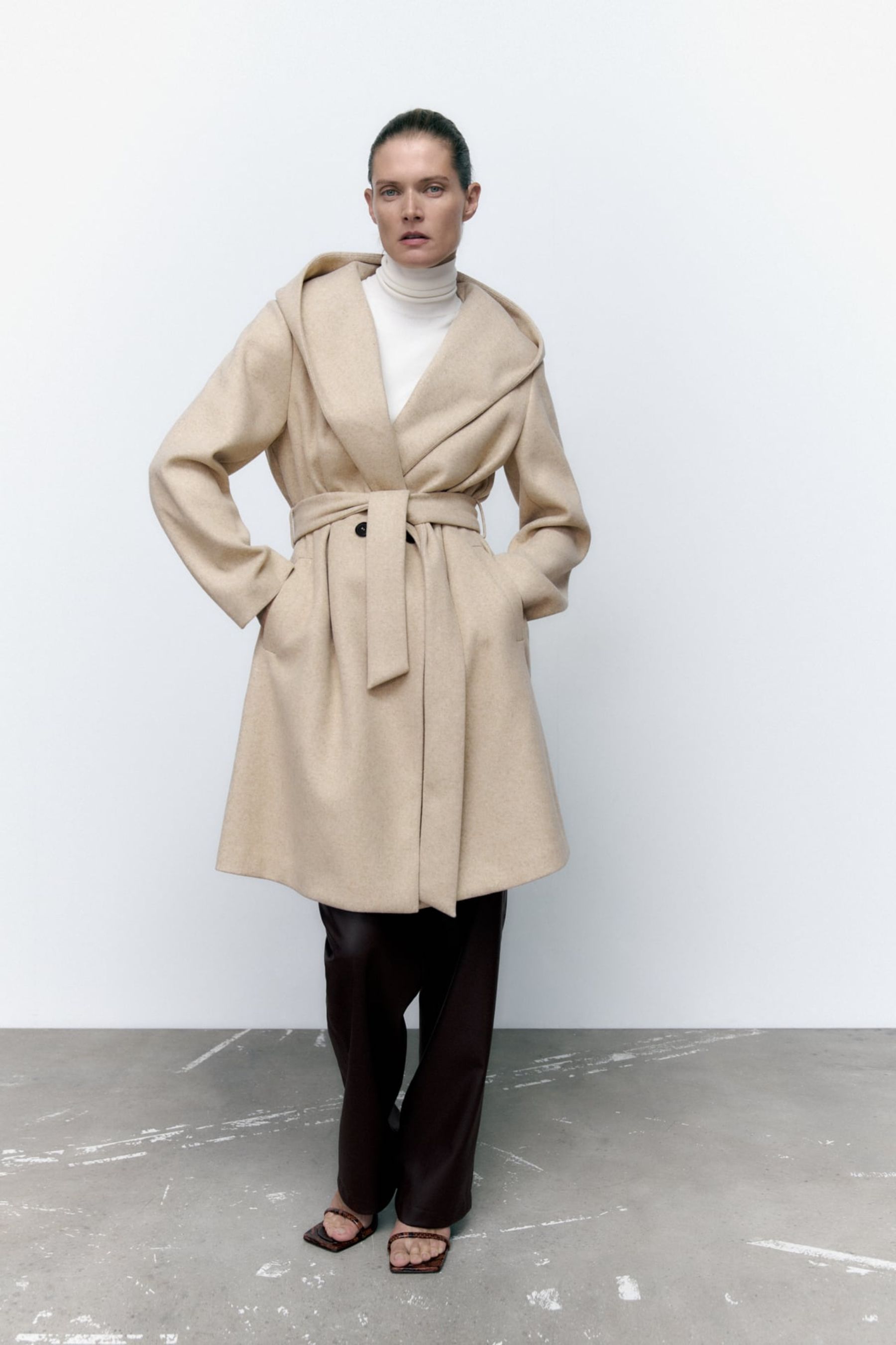 Look con abrigo beige, jersey blanco y pantalón negro de Zara