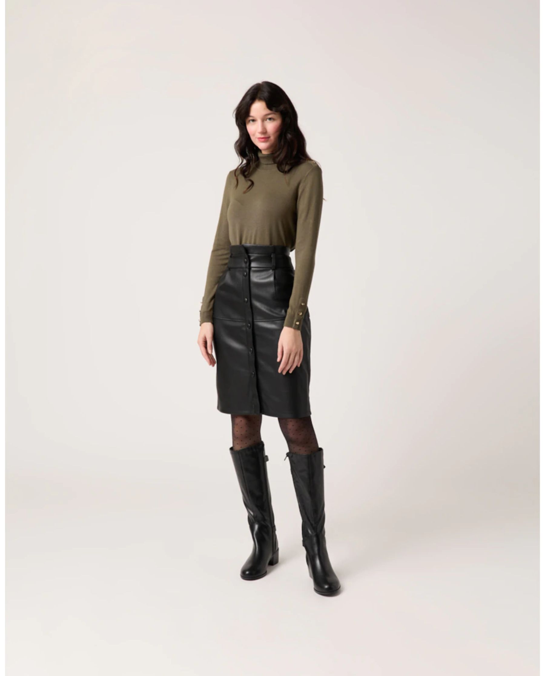 En El Corte Inglés puedes encontrar esta falda midi de efecto piel de la marca Naf Naf que es además una de las más buscadas actualmente porque está rebajada (pasa de 67,90 euros a 46,90 euros), y que puedes combinar con un jersey que tengas en casa o uno como la de la modelo (27,90 euros), en color kaki y botas altas tanto con tacón como planas.