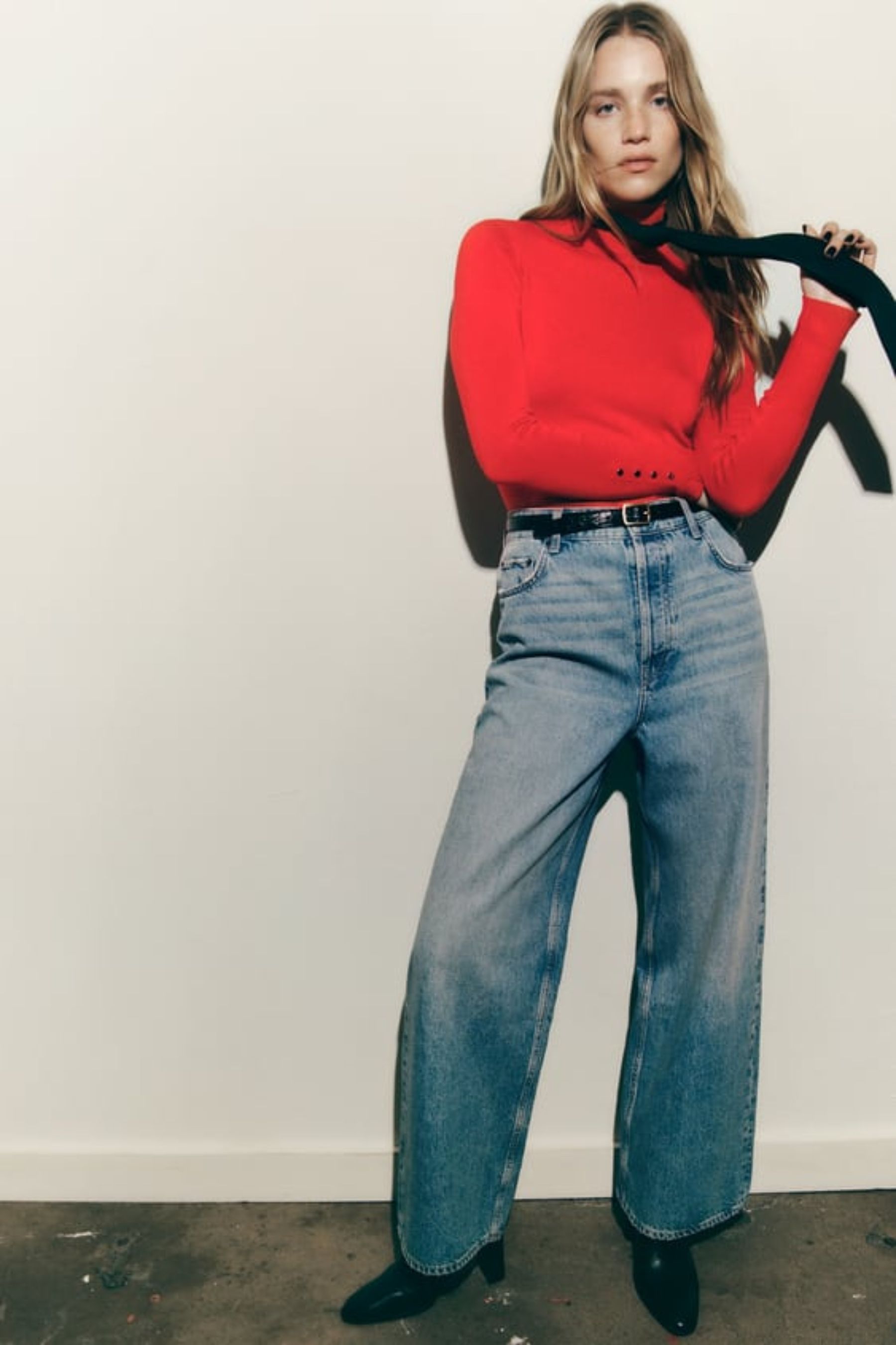 Comenzamos con algo básico, un jersey de Zara en color rojo (aunque se vende en otros muchos colores) con cuello subido (22,95 euros), combinado con jeans comfort mom fit (25,95 euros). En cuanto al calzado podéis elegir unas botas, botines o unas deportivas. Un look perfecto para llevar por ejemplo a los niños a la cabalgata de reyes.