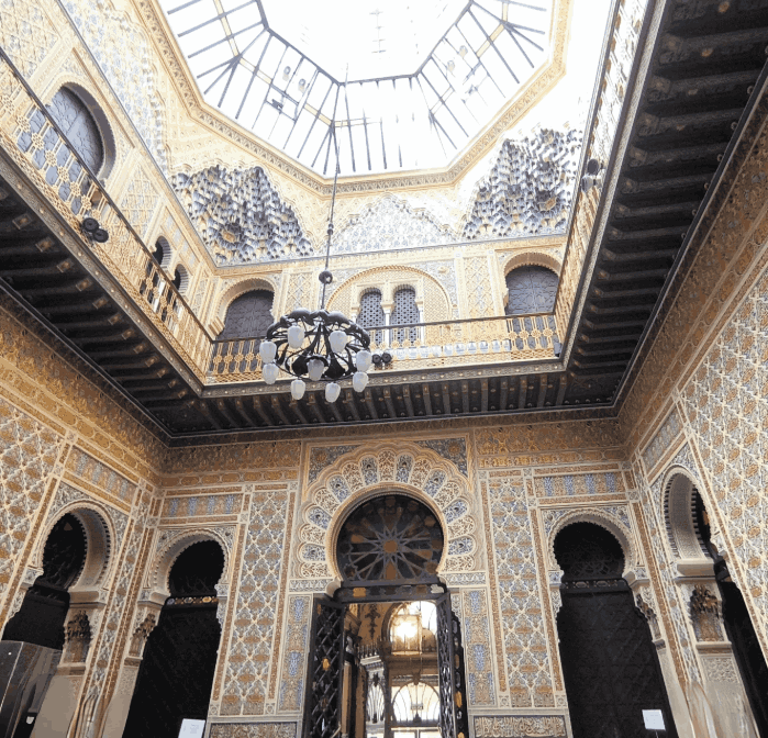 La hermosa fachada de este edificio en pleno casco histórico murciano ya avisa de lo que nos vamos a encontrar dentro. El Real Casino de Murcia sorprende por su mezcla única de estilos arquitectónicos, desde el modernismo de las portadas hasta los arcos neonazarís de las salas principales, conocidas por su aspecto como peceras. Se estableció en 1853 como punto de encuentro de la alta sociedad, un espacio lujoso para la burguesía cuya ostentosa decoración sigue deslumbrando hoy en día.