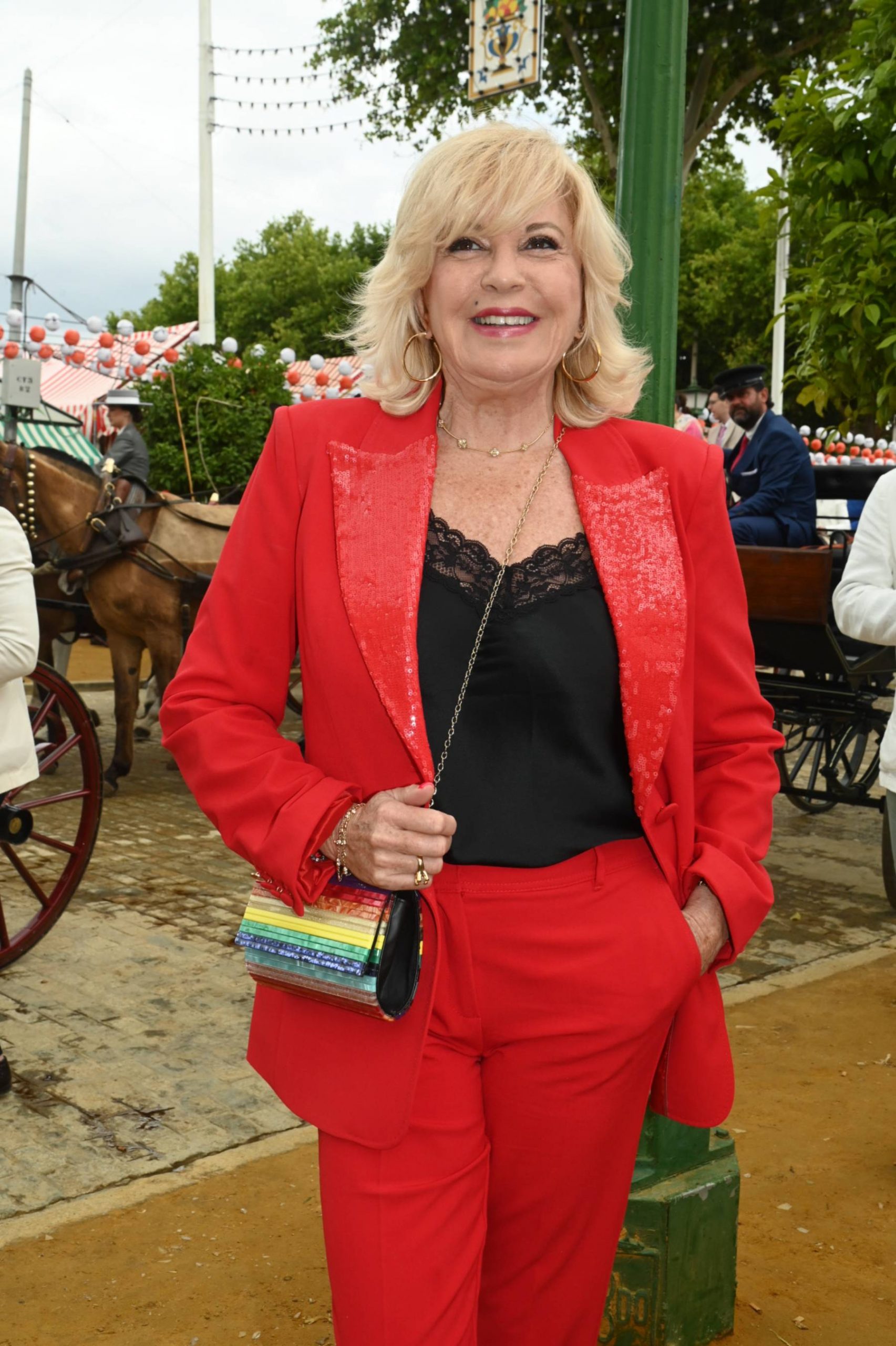 Bárbara Rey, una de las grandes leyendas del espectáculo español, también ha hecho su aparición en la fiesta con un llamativo traje rojo con brillos. La ex vedette ha escogido un look elegante y sofisticado que ha combinado con una camisola negra con encaje en el escote que ha roto con la tradición andaluza. Su original elección de un bolso multicolor ha añadido un toque moderno a un conjunto que, sin duda, no ha pasado desapercibido.