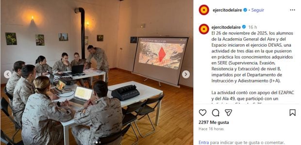 «Los alumnos de la Academia General del Aire y del Espacio iniciaron el ejercicio DEVAS, una actividad de tres días en la que pusieron en práctica los conocimientos adquiridos en SERE (Supervivencia, Evasión, Resistencia y Extracción) de nivel B, impartidos por el Departamento de Instrucción y Adiestramiento (I+A)», escriben desde su cuenta oficial de Instagram.