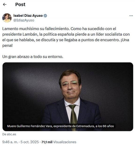 La presidenta de la Comunidad de Madrid acumula más de 10.000 seguidores en X (antiguo Twitter) y ha aprovechado este altavoz para mandar un mensaje cargado de sentimiento: «Lamento muchísimo su fallecimiento. Como ha sucedido con el presidente Lambán, la política española pierde a un líder socialista con el que se hablaba, se discutía y se llegaba a puntos de encuentro. ¡Una pena!». Después de estas palabras adjuntaba una imagen de Fernández Vara y se despedía diciendo: «Un gran abrazo a todo su entorno».