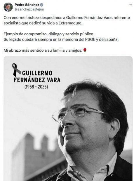 Precisamente, el presidente del Gobierno también ha querido pronunciarse tras este suceso y también ha recurrido a X para mostrar sus condolencias: «Con enorme tristeza despedimos a Guillermo Fernández Vara, referente socialista que dedicó su vida a Extremadura. Ejemplo de compromiso, diálogo y servicio público. Su legado quedará siempre en la memoria del PSOE y de España. Mi abrazo más sentido a su familia y amigos».