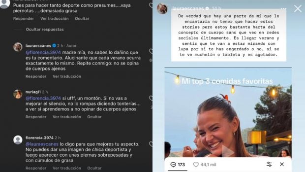 Laura Escanes ya ha hecho su primer posado veraniego en el mar de Menorca, su happy place. Sin embargo, lejos de lo que se esperaba, la influencer ha recibido comentarios despectivos sobre su cuerpo que ha mostrado públicamente a través de sus historias temporales de Instagram: «Para hacer deporte como presumes… vaya piernotas… demasiada grasa. Te lo digo para que mejores tu aspecto. No puedes dar una imagen de chica deportista y luego aparecer con unas piernas sobrepasadas y con cúmulo de grasa». Un comentario que la creadora de contenidos ha respondido: «Madre mía, no sabes lo dañino que es tu comentario. Alucinante que cada verano ocurra exactamente lo mismo. Repite conmigo: no se opina de cuerpos ajenos».