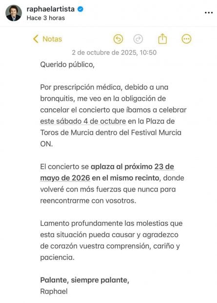 La bronquitis que impidió que Raphael se encontrase con sus fans de Zamora no ha desaparecido, de ahí que haya anunciado su ausencia en la Plaza de Toros de Murcia. «Por prescripción médica me veo en la obligación de cancelar el concierto que íbamos a celebrar el sábado 4 de octubre», empieza diciendo. «Se aplazará al próximo 23 de mayo de 2026 en el mismo recinto», asegura. Con este gesto, demuestra que tiene muy presente a su querido público y que su intención es continuar con su trayectoria.