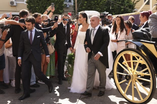 El vestido en cuestión ha sido confeccionado en crep y una de sus características más especiales es que una de las zonas tiene un bordado con hilos de seda que evoca a los mantones de Manila. De esta forma, la novia ha tenido un bonito gesto con Sevilla, ciudad que a partir de hoy quedará para siempre en su memoria.