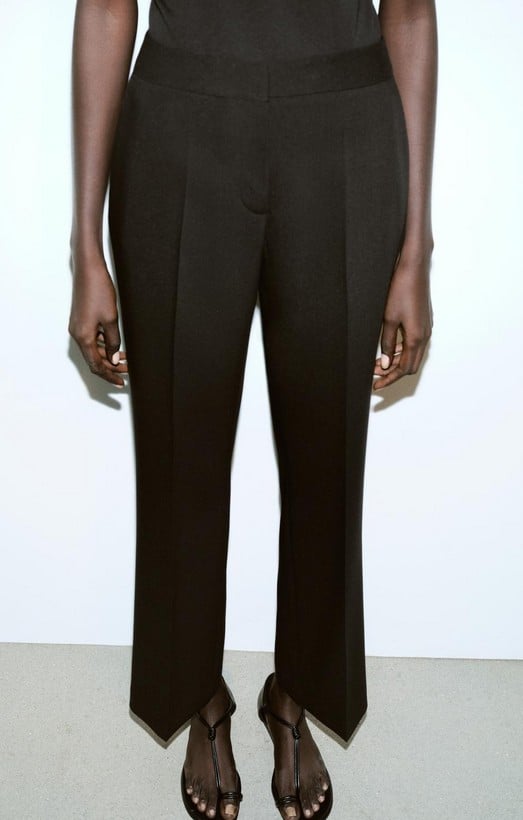 El pantalón recto de tiro alto, con un precio de 35,95 euros, refuerza la verticalidad del conjunto. El tiro elevado estiliza la figura y alarga visualmente las piernas, mientras que la pernera recta aporta sobriedad. Los bolsillos delanteros resultan funcionales, y los falsos bolsillos traseros mantienen la línea depurada sin añadir volumen innecesario.