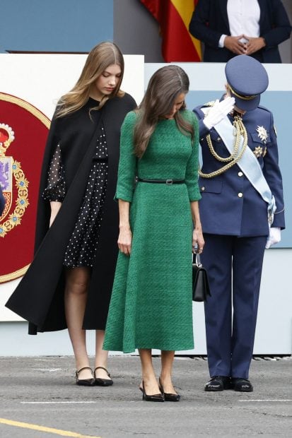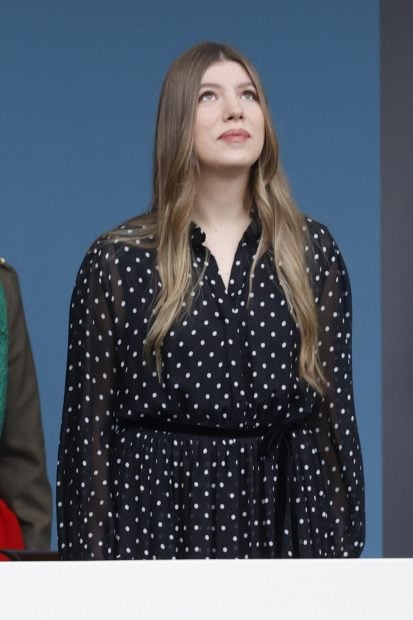 Mientras que la princesa Leonor ha lucido uniforme militar -en este caso el del Ejército del Aire y del Espacio-, la infanta Sofía ha elegido para esta ocasión un precioso vestido corto en color negro con lunares. Un diseño que ha combinado con una espectacular capa negra, muy al estilo de las tendencias que hemos visto recientemente en otras royals de su generación. Como calzado, la infanta ha llevado unas bailarinas destalonadas de color negro de Magrit. La hija menor de los Reyes no suele llevar zapatos de tacón, probablemente por su altura. Sofía es casi tan alta como el Rey Felipe VI.