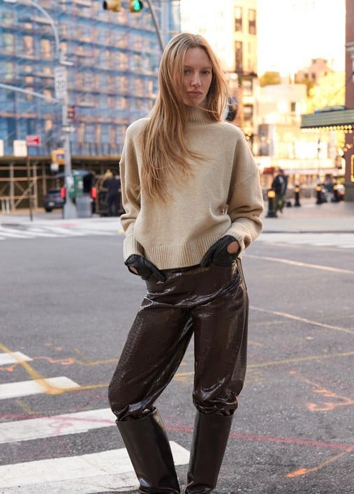 A la vez, esta chaqueta de punto es combinable con los jeans en color chocolate que también muestra esta chica en la red. Son unos jeans de tiro alto confeccionados en hilatura con mezcla de algodón. Cintura con trabillas. Bolsillos de plastrón en espalda con ese detalle de costura marcada en delantero. Pierna ancha. Cierre frontal con cremallera, botón y gancho metálico.