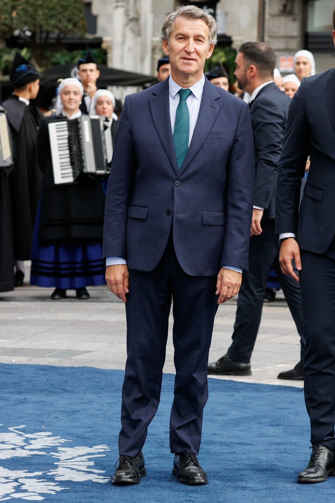 En el terreno político, Alberto Núñez Feijóo, presidente del Partido Popular, se ha convertido en la única figura política que se ha dejado ver sobre la alfombra azul del Teatro Campoamor. Acompañado por el líder de los populares asturianos, Álvaro Queipo, Feijóo ha hecho su aparición con un impecable traje azul marino, que ha combinado con una camisa blanca clásica y una corbata en tono verde agua, aportando un sutil toque de color al conjunto. Su presencia ha sido una de las pocas excepciones institucionales en un evento dominado por el ámbito cultural, social y deportivo.