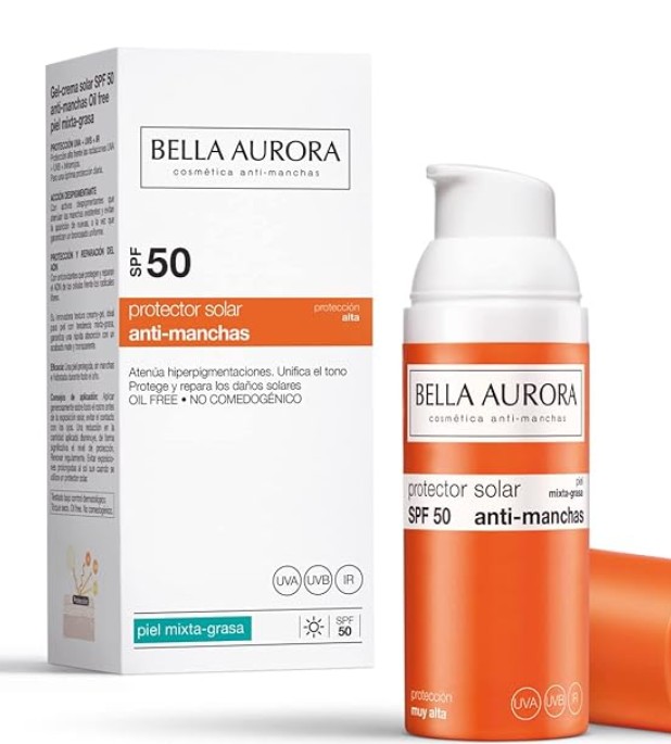Según Bella Aurora, es un protector solar fluido SPF50+ formulado para piel normal o con tendencia a seca. Proporciona una alta protección frente a las radiaciones solares UVA, UVB, luz visible (HEV) e infrarrojos (IR). Su fórmula innovadora protege eficazmente contra los rayos solares y luz azul, previniendo el fotoenvejecimiento y la aparición de manchas. Protege tu piel del sol mientras cuidas su equilibrio y luminosidad. ¡Incorpora este imprescindible a tu rutina de cuidado facial!