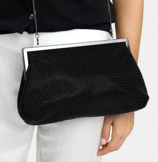 Este conjunto de detalles lo convierte en un accesorio adaptable, que puede usarse tanto como clutch elegante o como bolso al hombro gracias a su cadena desmontable.