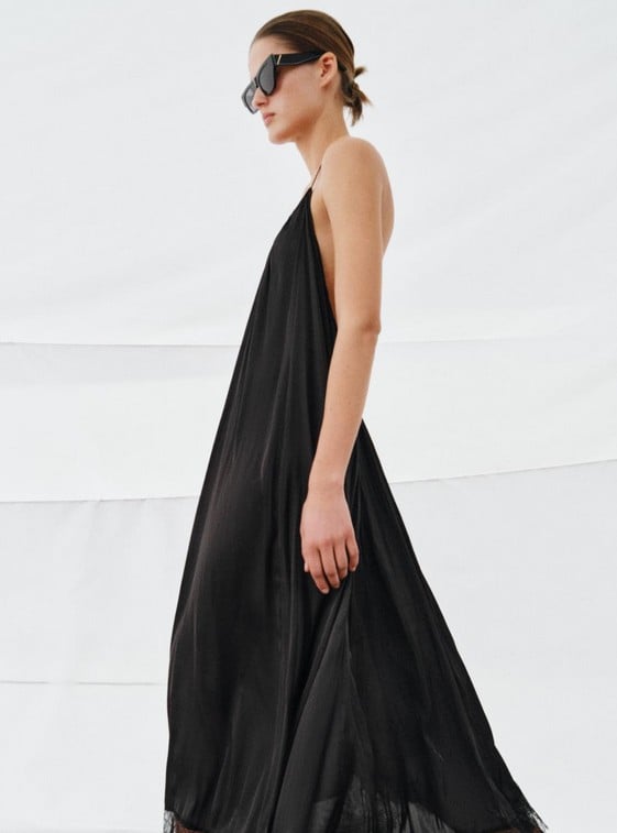 El diseño halter de este vestido satinado de Zara enmarca el cuello y los hombros, resaltando la parte superior del cuerpo con equilibrio y sofisticación. Este tipo de escote estiliza los brazos y dirige la atención hacia la zona del escote de manera elegante.