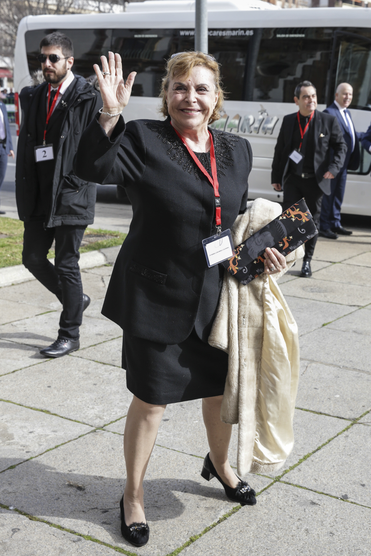 Para esta ocasión, la consorte ha estrenado un conjunto en blanco y negro en estampado de pata de gallo de la firma alemana Hugo Boss. Se trata de una falda de tubo de largo midi y un top entallado de manga corta. La Reina ha combinado el conjunto con accesorios en rojo, para aportarle un punto de contraste al más puro estilo español: Zapatos de Magrit en ante rojo y tacón de 9 cm, pendientes de oro blanco, diamantes y rubíes y abrigo cruzado también de la firma alemana. La esposa de Felipe VI ha prescindido de sus habituales bolsos en forma de clutch y esta vez ha estrenado un bolso de estilo kelly en color negro de Hugo Boss, modelo Adrienne.