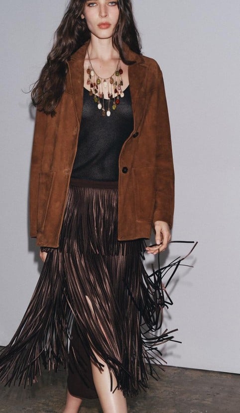 Hablamos de la falda midi de flecos. De tiro medio, destaca, especialmente por ese detalle de aplicación de flecos combinados a tono. Cierre lateral con cremallera oculta. Al paso y andando, ejerce un movimiento de flecos mientras que si bailas entonces ya es una prenda superior. La debes tener, pero date prisa porque se agota, sobre todo en la web. puedes ir también a la tienda física, y buscar tu talla. Tienes una prenda para siempre y para los mejores actos.