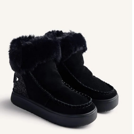 El collarín de pelo que rodea la parte superior no es únicamente decorativo. Además de aportar una estética envolvente y actual, refuerza la sensación de abrigo en la zona del tobillo, especialmente en días fríos. A esto se suma la pieza brillante ubicada en el talón, un detalle sutil pero llamativo que eleva el diseño y lo acerca a propuestas vistas en pasarelas internacionales.