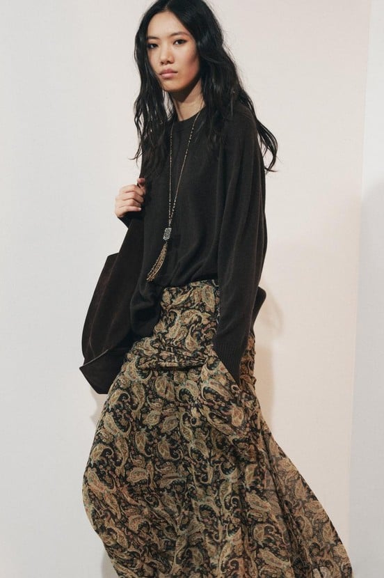 En su línea “ZW Collection” presenta prendas especialmente diseñadas para esta época del año: tejidos que admiten capas, estampados relevantes y cortes pensados para el entretiempo. Esta falda larga de estampado paisley pertenece precisamente a esa colección y cumple con lo que se espera de la moda otoñal: elegancia sin rigidez, versatilidad sin perder identidad.