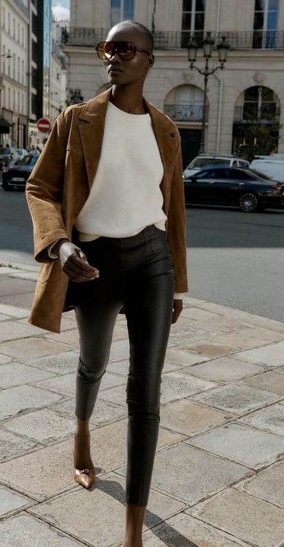 La combinación de leggings con zapatos de tacón tipo pump es una de las más potentes de la temporada. Inspirada en el estilo de las modelos off-duty y las editoras de moda, esta mezcla equilibra la comodidad del punto elástico con la sofisticación del tacón clásico. Los leggings negros o en efecto cuero son ideales para este tipo de calzado, especialmente si se acompañan de un blazer oversize o una camisa blanca.