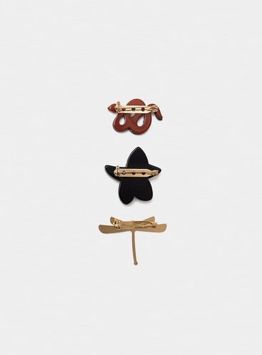 En el set de broches de Parfois, la resina se presenta en combinación con acabados dorados y plateados, tanto brillantes como mates. Esta mezcla aporta profundidad visual y una sensación de riqueza estética que eleva el conjunto. Además, la ligereza del material facilita su uso prolongado, evitando el peso excesivo sobre las prendas.