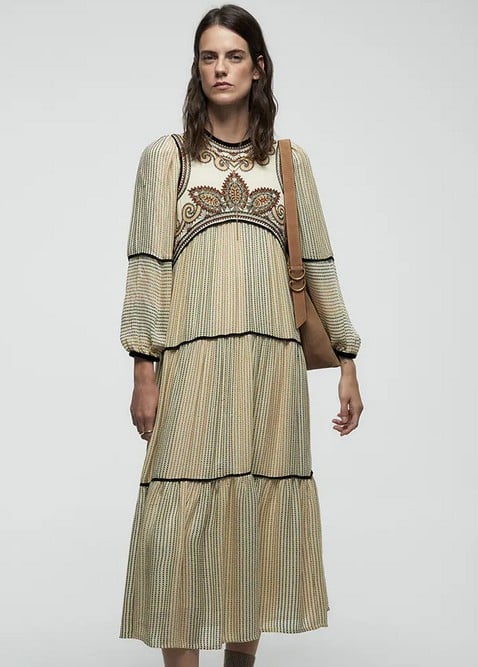 La propuesta de Sfera incluye vestidos con detalles diferenciales que aportan personalidad al look. Un ejemplo es el vestido largo con pechera bordada, que destaca por su estampado y por ese guiño artesanal tan en tendencia.