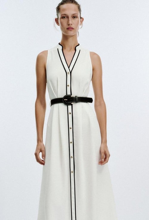 Zara siempre apuesta por vestidos que equilibran sencillez y sofisticación. Uno de los más destacados es un vestido midi con vivos a contraste, en color blanco roto, que lleva un cinturón, incorporando un corte favorecedor con escote pico y manga sisa.