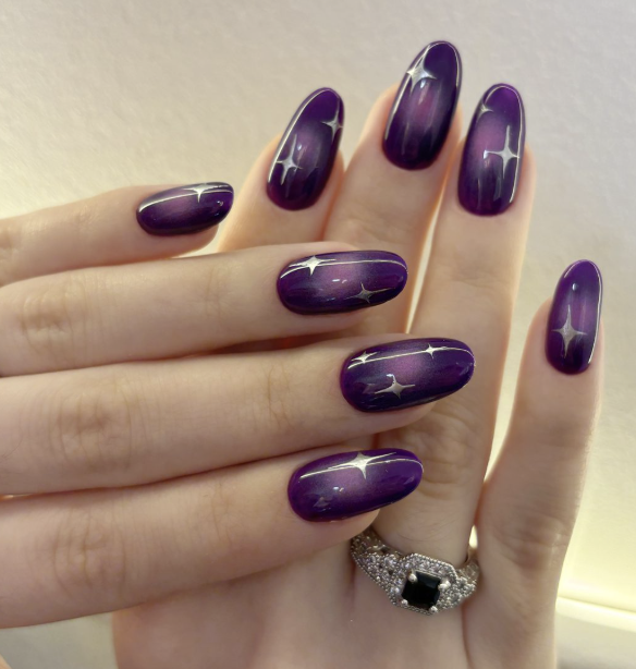 Las uñas velvet se caracterizan por un acabado brillante, profundo y aterciopelado que cambia con la luz. El efecto no se consigue mediante purpurina tradicional, sino a través de esmaltes magnéticos o pigmentos especiales que reaccionan a un imán, concentrando las partículas metálicas en diferentes direcciones. Es este movimiento interno lo que genera la apariencia de “pelito”, “suavidad visual” o terciopelo iluminado desde dentro.