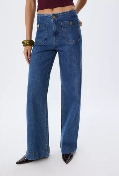 Los bolsillos de plastrón en la parte delantera son inusuales en los jeans tradicionales, lo que les confiere un aire retro, mientras que el detalle de los botones dorados introduce un guiño elegante que recuerda a la sastrería.